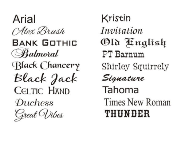 Font Style: Block or Script (Font Examples In Pictures Above)