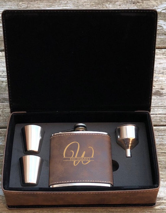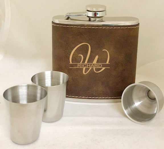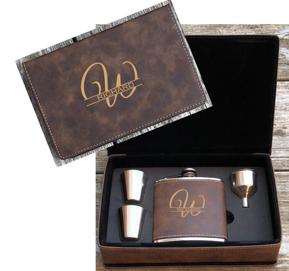 Groomsman Flask Engraved Best Man Usher Personalized Father of the Bride Leatherette Gift Set