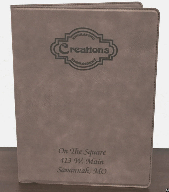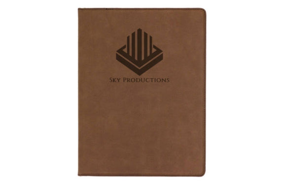 Soft brushed leather cover engraves beautifully. Features inside junior note pad size 8 1/4" T x 5 3/4" W (included). A classy and convenient way to take important notes. Delivered in a gift box and includes 30 engraved characters of your choice. Inside includes a note pad as well as a pocket for papers and a smaller pocket for business or other cards and also a pen loop for holding a pen. Custom graphics & logos available by selecting that option from the drop down menu above.
