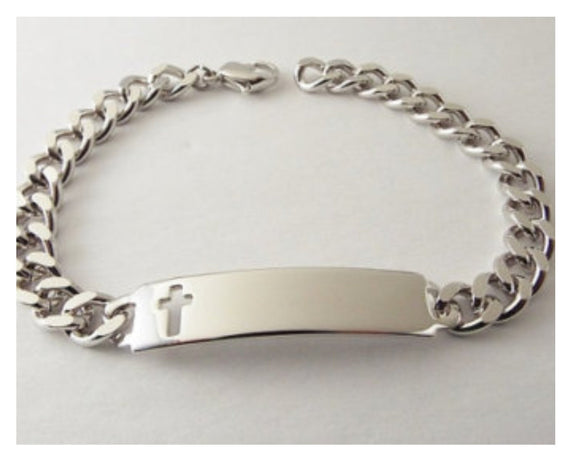 Mens ID Bracelet Cross Cutout - Personalized Speidel Silver Custom Hand Engraved Free