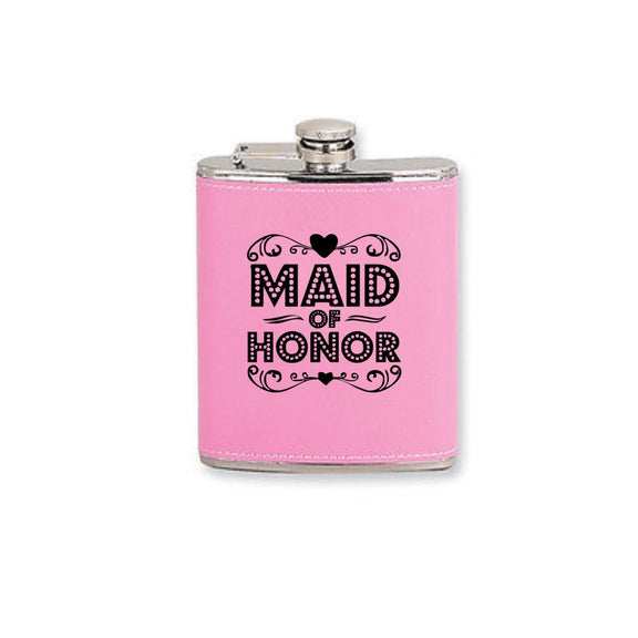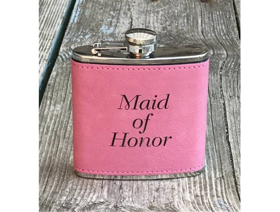 Personalized Pink Flask Leatherette Maid of Honor Bridesmaid Womans Engraved