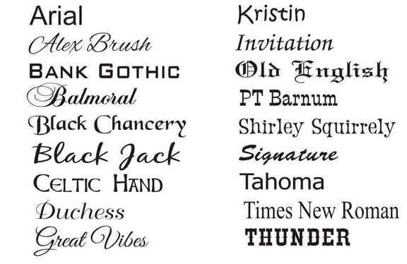 Font Style: Block or Script (Available fonts shown in the picture section above)