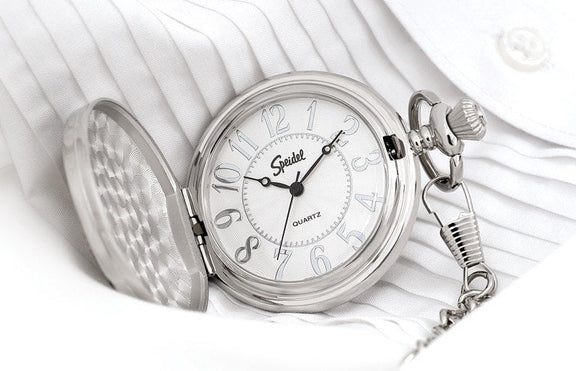 Genuine Speidel quality featuring a white face with silver trim. Includes a 12" chain and 25 free engraved characters of your choice. Quartz battery movement and Speidel's limited 2 Year warranty. Packaged in an attractive blue Speidel Gift Box.